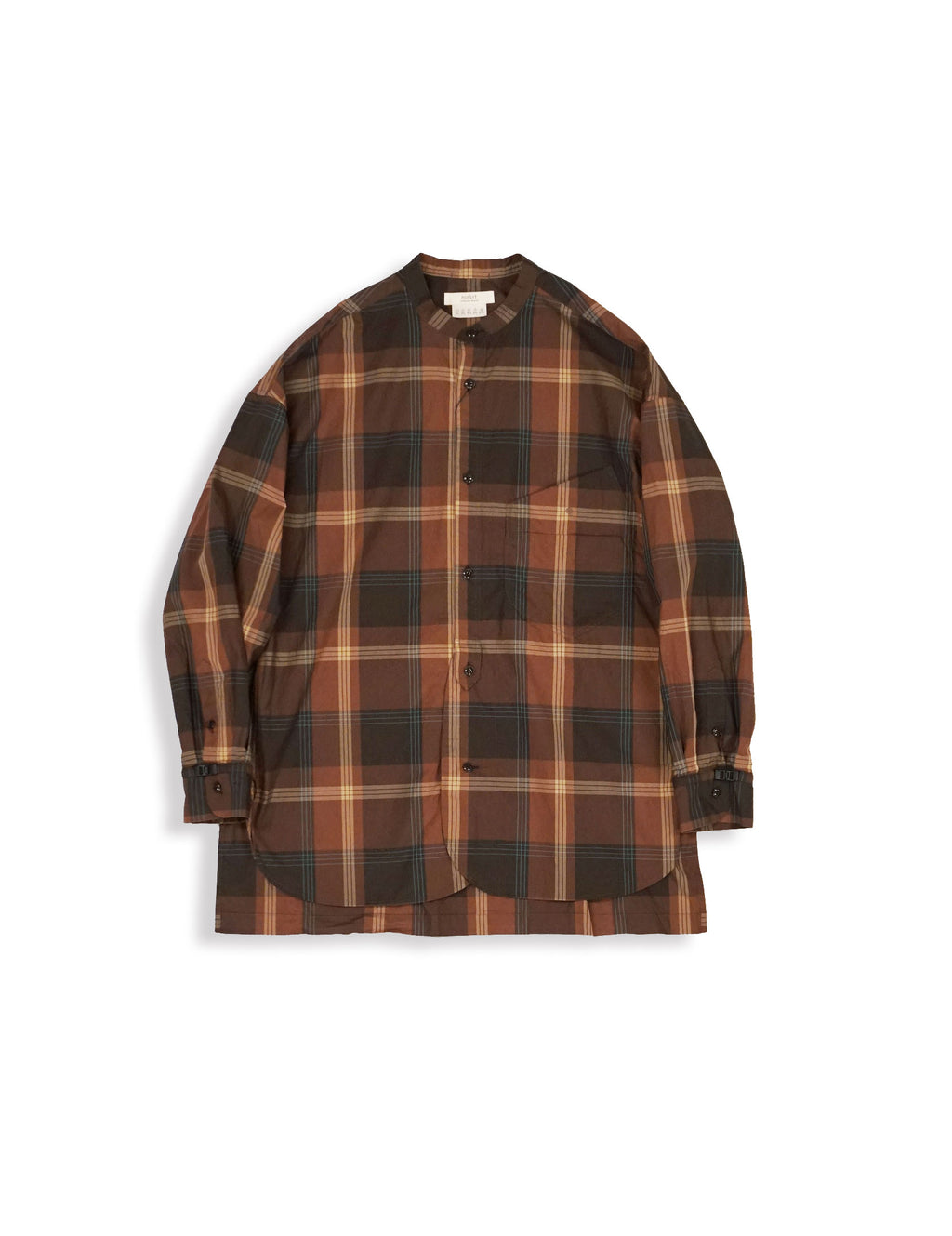 大きなチェックパターンのタイプライター生地のスタンドカラーシャツ。胸には2層のポケット、袖口にはnorbtオリジナルギミックのエラスティックバンドを用いています。ゆったりとしたシルエットでウエイトも軽く着心地のとても良いシャツに仕上がっています。