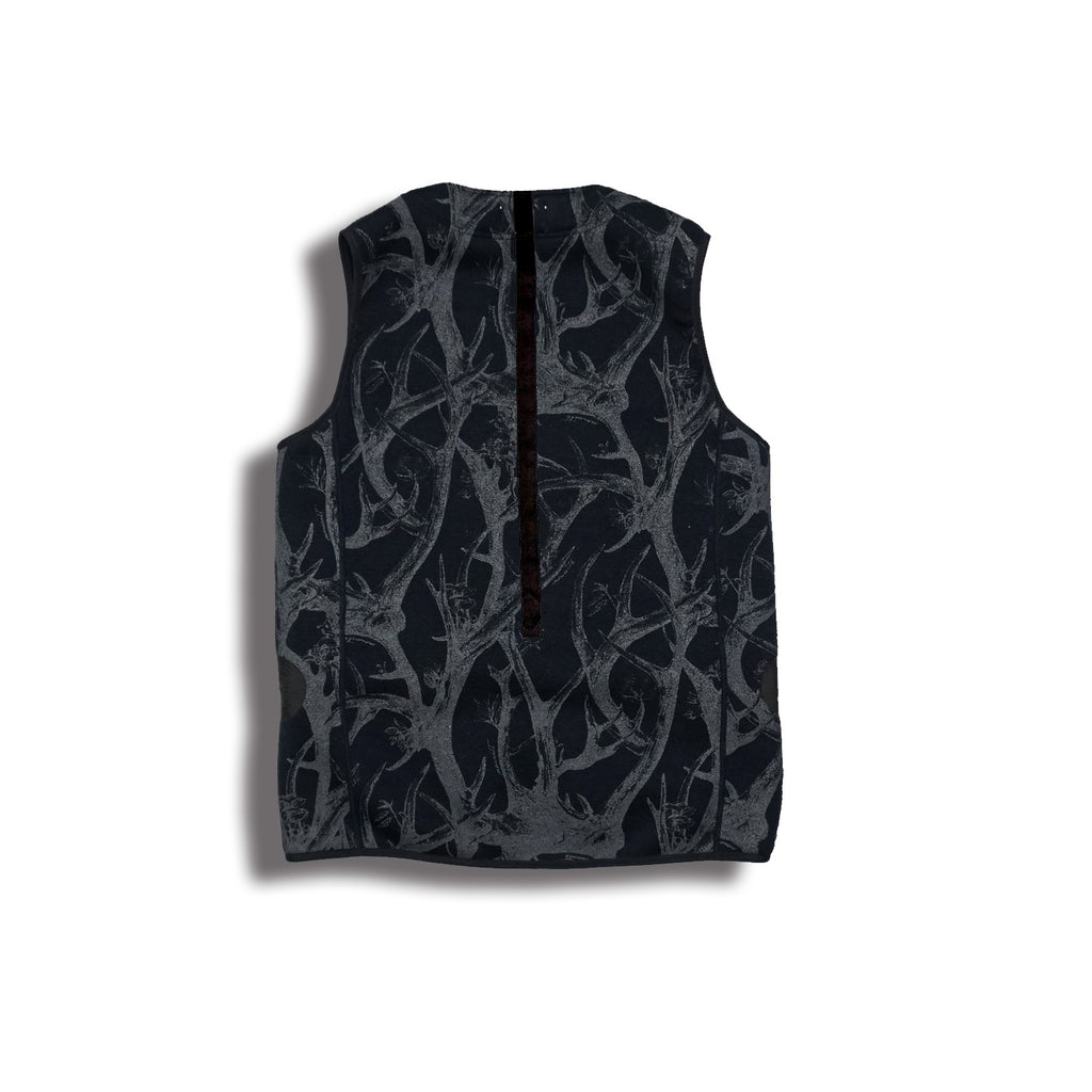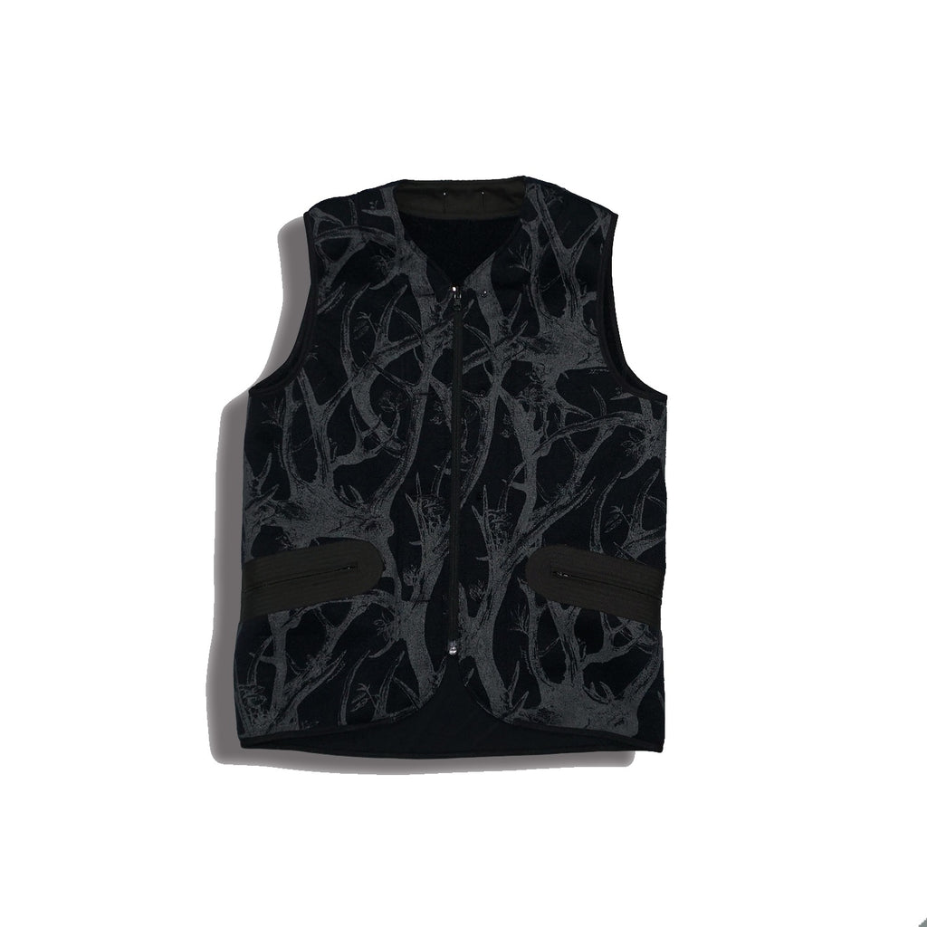 This vest is double use of HNCT-007 Liner of Fish Tail Wild Coat. It has large capacity pockets. The back surface with Boa fabric is used Horn Tree Pattern by nowartt (Textile Graphic Brand). It is able to enjoy wearing different images at both back and front.