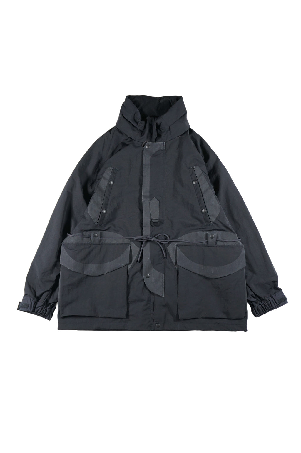 立ち襟部にフード収納、クロス付のウエストスピンドル、背面にはゲームポケット、サスペンダー内蔵などギミック満載。デザインポイントと補強を兼ねたプリント部が大きな特徴で一枚仕立てのフルシーズン愛用可能なアイテムです。