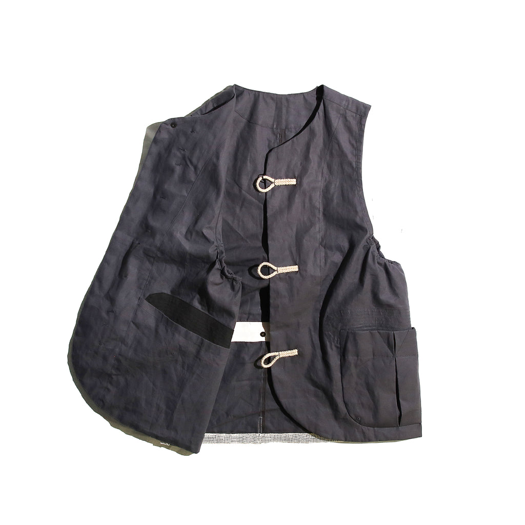 難燃加工を施した、高密度コットンタッサー生地を使用しています。ダッフルボタンをパラシュートバタン仕様にアレンジし、バックには大容量のコットンメッシュポケットをあしらったユーティリティーベスト。焚火などのシーンにも最適。
