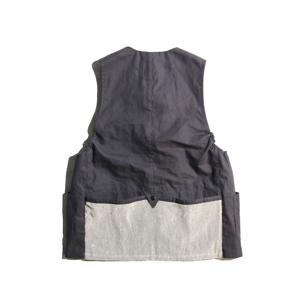he fabric is high density cotton tasser with flame-retardant processing.It is arranged to use parachute bottons instead of duffle bottons.Also, this utility vest has a great capacity of cotton mesh pockets at back. so that it would be safe in outside.